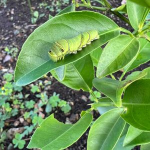 赤みかんの葉っぱにアゲハ蝶の幼虫🐛🩷 2日前までは黒かったので可愛いとは言えない見た目だったけど 「うわ!アゲハの幼虫来た✨✊」と内心ガッツポーズ。 5齢幼虫ともなると可愛さ炸裂🩷 夏場だけ地植え中の赤みかんの葉っぱで足りるかな? 丸坊主になったら山椒の木に移ってもらおう🐛✨