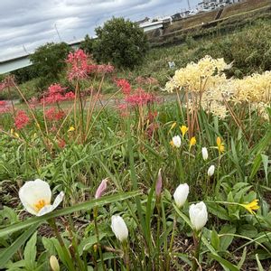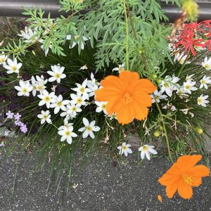 タマスダレ咲き始めました🤍 側からケイトウの零れ種からの!🧡 ピンクのイヌタデも加わり🩷 野の花達は元気です🍀