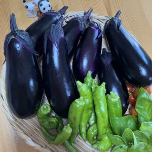 秋ナスが穫れました 甘長シシトウ・バジルも元気です ミニトマトは終わりかな それにしても今日は 暑いです☀️ エケベリア達は、まだ遮光継続❗️