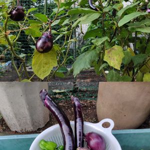 秋ナス🍆の初収穫できました〜😆 夏のナスの収穫が終わり 更新剪定してみたら、再びナスがたくさん実り 幸せ〜╰(*´︶`*)╯♡