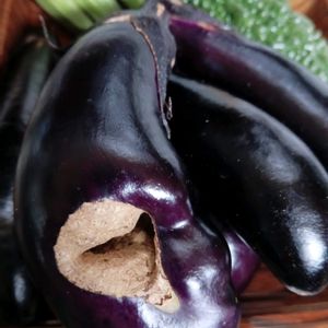 🍆ユニークなナス🍆 秋ナスの中に、空洞のあるこんなナスが採れました〜! 無農薬栽培ゆえの害虫被害なのでしょうね!
