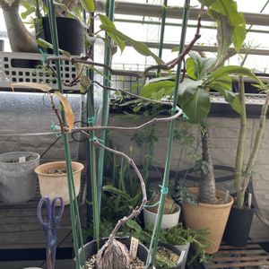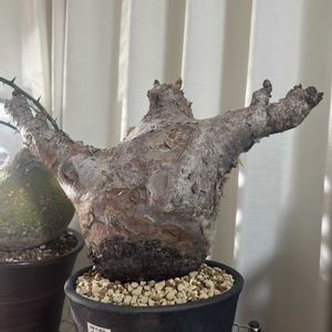 キフォステンマ マクロプス。 去年の7月に仲間入りした株。 寒さに弱いとのことだったが、温室なしでも何とか越せたみたい( ・ㅂ・)و ̑̑ この冬は特に寒くてパキポディウム アンボンゲンセは温室無しだとダメだったみたいで、何とか一命はとりとめたがなかなかの無惨な姿に(´△`) 早く温くなってくれ(´;ω;`)