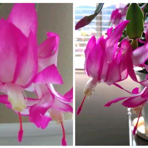 新年早々花を開かせたシャコバサボテン。なんて遅い開花なんでしょうか 昨年の花終わりの始末が間違っていたのではないかと大変心配しましたが、無事に開花して安心しました。