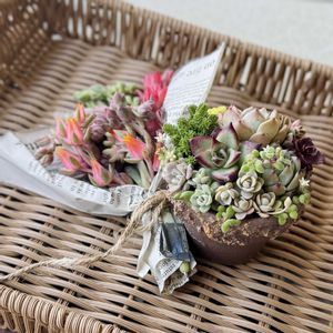 おはようございます インスタで旦那様から 奥さんが寄せ植え習いたいと DMが来て マルシェ当日 ご家族そろって遊びに来て 頂きました。 ブース内のリメ鉢を選んで サポートしながら 素敵な寄せ植え完成しました。 奥様も自分でこんなに綺麗に 仕上がった事ないと 感動してました。 プレゼントした多肉植物の 花芽と一緒に 写真に納めました。 旦那さんはアガベが 好きみたいで リメ缶をオーダー頂きました! いつもマルシェに ご来店して頂き ありがとうございました。