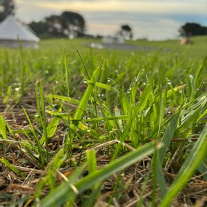 朝露がキラキラ光っていた芝生。日の出から1時間くらい経った頃。陽の光に照らされたクロマツの幹が赤くなっていて、赤松のよう😄