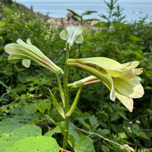 オオウバユリの花の時期にやっと出会えた。春に見たあの艶のある大きな葉っぱはほとんどすっかり茶色くなって枯れていた。なんと花の時期に「葉がない」と「歯がない」をかけてこの名がついたとか。