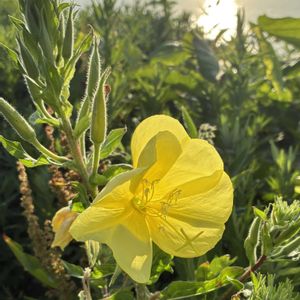 朝日に透けるオオマツヨイグサ。日の出を楽しんでお散歩、やっとちゃんと咲いてる姿に出会えました。いつも半分萎れてたから、早起き散歩した甲斐がありました!