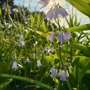 朝日に透けるツリガネニンジンと、透けてないけど蝶々と一緒。
