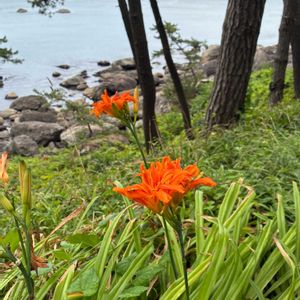 海を見ながら松林を歩いて出会ったヤブカンゾウ、ラセイタソウ、一番綺麗な花の時期がわからないエゾオグルマ。