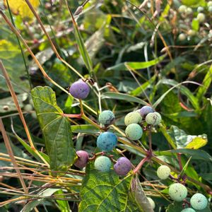 カラフルなノブドウとハマハイビャクシン。カラフルな実は虫こぶが多いらしい。ハマハイビャクシンは海岸植物。