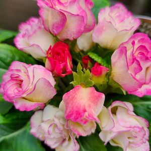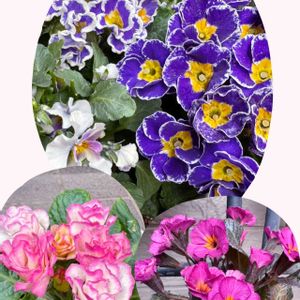 今日のお花『プリムラ』🩷🤍💜 ①お正月🎍の寄せ植えにプリムラジュリアン2種を植えました。 白地に縁がピンクのフリルが可愛い『シルキー』🤍🩷と、半八重品種『冬の祝福』も明るいピンク🩷に白🤍の絞り模様になってて、いい感じ💓💓 ②今年もまたお迎えしてしまったバラ咲き🌹のジュリアン『マスカットのジュレ』💚…爽やかなお色です💕 ③ジュリアン『ジュエル』もバラ咲き🌹…白🤍からうす紫💜に変わっていくのかな? ④これも『ジュエル』…白🤍が眩しいくらい😊✨ ⑤これも去年に引き続きお迎えしたバラ咲きジュリアン🌹『プリンアラモード』🍮…食べたくなるようなお名前❣️ 暮れにお迎えしてまだ植え付けてません😅💦 暮れから昨日まで孫達が来ていたので水やりだけで精一杯でした💦 明日には植え付けようっと😊💕