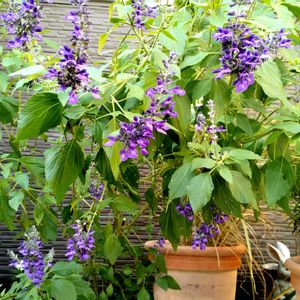 また竜巻注意報📣 大丈夫かな…… ①モッサモサでアンバランスなゴールデンクレスト ②これから荒れるのに咲いたラベンダーセージ ③玄関内へ移動の大文字草 葉っぱがいやに大きいわ