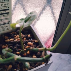 母の手元から救出。 完全に水遣りのし過ぎでした。 まだ緑色の部だけを新しい土に移植。 ちっちゃくて黒いツブツブが目について。 よーく観ると👓️ 微かに黒い縞がある細〜い緑色のクネクネちゃんが月兔耳の葉を貫通していました😵 傍に置いた産直からの新鮮大根か小松菜からハシゴしてきたのだと推測されます。 野菜もそれだけ害が無いと言うことですよね😃