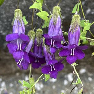 散歩道に咲いてます つる性で朝顔のようでもあるし? 初見👀のお花かな? 💜アサリナ💜フジスダレ💜 オオバコ科(ゴマノハグサ科)キリカズラ属 開花期7〜11月 つる性植物 一年草 キンギョソウに似たベル形の花です