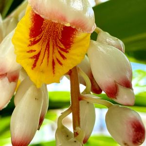 おはようございます😊 今日の天気は曇り時々 雨 ☁️☔️ 最高気温29度 最低気温26度 我が家の裏花壇より🌸🌼🌺 🌿🤍💛月桃(ゲットウ)🤍❤️🌿 今朝はどんよりと曇って☁️今にも雨が降り出しそうな天気です🌧️ うりずんの季節に花が咲きはじめた裏花壇に自生しているサンニン(月桃)🌿🤍❤️💛🌿そろそろ終盤を迎えています😓 木から垂れ下がり堤灯のような白い花を咲かせ…ラッパ状の花の中は黄色で中心から赤く筋が入っています💛❤️月桃の葉や花からは特有の良い香り〰️💕🥰白い蕾の先がほんのりピンク色🩷で可愛いですね💕😍 月桃(ゲットウ)の香り〜💕 葉で包んだムーチー(餅)大好きです💕💚🥰我が家は月桃の花は花瓶に生けて観賞用として🌿葉は細かく刻んでお茶パックなどに入れて防虫、防カビ用として使用しています💕🌿🥰🌿昨年より葉を月桃茶🍵として…アイス🧋がおすすめです🌿🌿🌿 🌿月桃の葉は沖縄では古くから邪気を払う薬草として…防菌作用があるので食べ物を包むのにも使用されて来ました🌿(化粧水、石鹸などにも)💚 🌿月桃の利用🌿 防虫、防カビ、抗菌、消臭、芳香、アロマ、化粧水、ハーブティーなど🌿🥰 🌿旧暦12月8日 🌿 ムーチー(鬼餅)の日🌿 月桃の葉で包んで蒸した餅を 旧暦の12月8日には厄払いの為に 神仏に供え家族の健康を祈願する 年中行事!無病息災☆家族の健康を願いヒヌカン(火の神)お仏壇にお供えします🌿🌿🌿 🌿•*¨*•.¸¸☆*・🤍💛❤️•*¨*•.¸¸☆*・🌿