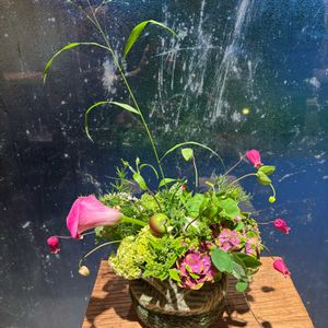 今月の教室は クレマチスを使ってのあしらいでした 紫陽花の中から顔を覗かせたベル型の紅いクレマチスがとてもチャーミングです 紅いカラーも可愛い💕グリーンのケイトウの中からもちらり❣️姫林檎もまだグリーンで爽やかです🥰 花屋さんの店内も軽音楽がかり 雰囲気がありアレンジされたお花の中いつもゆっくり見て回ります
