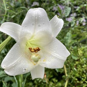 こんにちは😃 今日は一日 シトシト雨☔になりそう 庭の植物たちも ようやく、一息です! テッポウユリ雨☔に濡れ 涼しげに咲いています🎶