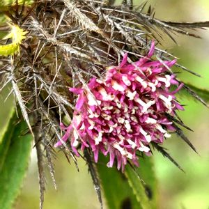 オケラ(朮)(白朮) キク科 オケラ属 本州から九州の日当たりの良い山地に生える 雌雄異株で雌花と両性花がある 花期は9〜10月 花は筒状花で5裂する 花の周りを魚の骨に似た茶色い網目状の苞が2列に囲む(魚骨苞) 若芽は食用に、根は生薬になる 又、刻んで焚くと疫病除けになるとされて来た(京都八坂神社おけら詣り) 万葉集ではうけら 山でうまいはオケラにトトキ 里でうまいはウリ、ナスビ(信州の里謡) 1️⃣アカバナオケラ(赤花朮) 2️⃣3️⃣4️⃣5️⃣オケラ(朮)