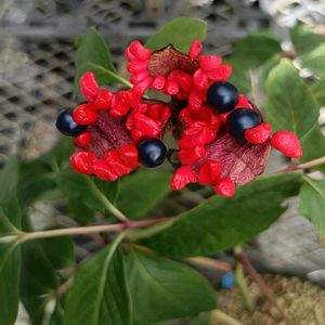 🔴🔵山芍薬の果実🔵🔴 ✳️再投稿✳️ 果実は袋果で 熟すと自然に開きます🎶 濃紺色の球形の種子と 未熟な赤い種子が現れる