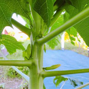 今年初めて植えた青パパイヤです❣️ 背が高くなってきて茎も立派になりました😊 沖縄の人はお野菜として食べてるそうですが果物だと思っていました💦 実がなってくれると嬉しいんですが😊