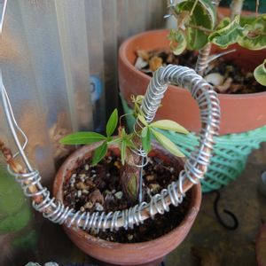 ダイソーのパキラを曲げ木に挑戦したまでは良かったけど、力加減に失敗してポキ! 先っぽは枯れてしまったけど、根本から新芽が出て、様子を見ていました。 葉っぱに異変が!斑入?枯れかけ?曲げ木ストレス?観察するしかなさそうですね