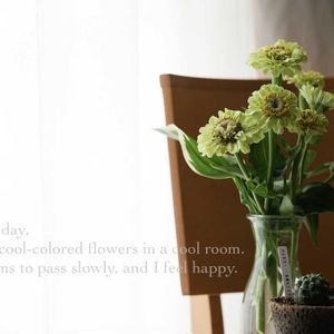 ⌘one day 暑いから 涼しい部屋で 涼しい色味の 可愛いジニアを愛でています💚