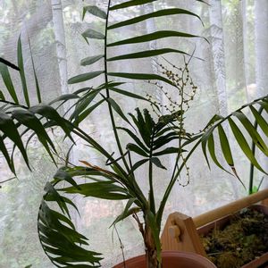 テーブルヤシに花が咲いています 数年前に百円ショップで購入したテーブルヤシです。 購入した時は10センチにも満たない小さな苗でした。 現在は大きく育つて今年初めて花を付けました。
