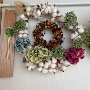 今日のお花 ワタ 元々ワタだけのリースを作り掛けてました ドライフラワーを作るとリースに置いて行くので季節によりあれこれ変わります 内側は別の木の実リースです 左側は平安神宮の花御札で8月の梶(カジ)