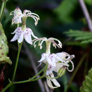 ヤマホトトギス (ユリ科) 鳥のホトトギスの胸にある模様と花の斑点が似ていることから、この名前が付いたそうな。花の色だけでなく形もとてもユニーク。大きな紫色の斑点がある花被片が反りくり返って開き、その中から出している雌しべの花柱は上部で3つに分かれて 更に先端で2つに分かれやや紫色の小さな斑点を持っています。複雑〜💦 写真3枚目の左側に写っている虫さんは、ササキリちゃんのようです。キリギリスの仲間とか🦗触覚が長〜い👀 四季の森公園にて撮影📷