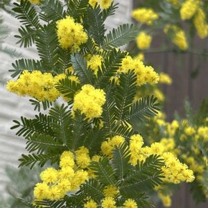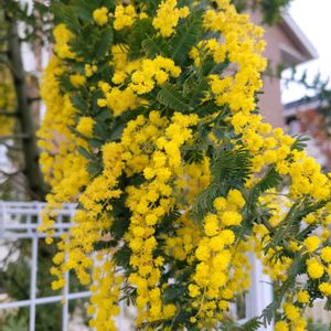 ご近所さんの💛ミモザ(銀葉アカシア)遅れていたけど〜😅 オマタセシマシタ〜って感じで あっと言う間に💛🥳💛🤗💛満開!🥰 フェンス越しに広がる、ビタミンカラー!😁👍