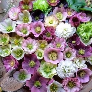 強風でございます🌀 お花がヨレヨレしてる💦 クリスマスローズ 地植えもカットしました ➀バードバス🐦 地植え1株1花で ②蕾も気にせず😂 一輪車に乗せて捨て場に ➂吊るしドライフラワー 第1弾が完成、カサカサに乾きました ミモザも一緒💛 ➃アップで 多弁はクシュクシュに ブロッチも残ってる😁 束ねたらスワッグに💐