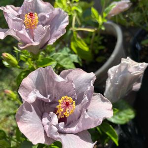 おはようございます╰(*´︶`*)╯♡ ハイビスカス ケイト💜🩶 一旦お花少なくなりましたがまた次々と蕾が😍 少し濃くなった今の色、とても素敵〜💜 ② ミニダリアも、お花少し🤏になりましたが休むことなく咲いてます❤️ ③ ワイルドスワンの後ろ姿が美しくて📸🦢 ④⑤ ハツユキソウ🤍今年も零れ種から🌱 あちこち掘り返したりするのであちこち出てきてた🌱ですが一つ残しました😁 いつも大きくなって強風で斜めに傾いたりするので今年は一度ひざ丈くらいでカット✂️ ちょうど良い高さで咲いてくれました🤍 涼しげな模様\(//∇//)\🤍 🌤️/🌫️⚡️ 33℃/21℃ ここにきて33℃😳 そして雷⚡️注意報💦⚡️怖い😱