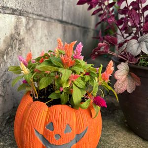 ハッピーハロウィン🎃🧟👻 ギリギリになっちゃいましたが、ハロウィン仕様の寄せ植えを作りました😅💦 ①ちょうど3日前にスーパーのお花屋さんに寄ったら“全部半額”の文字に釣られ、かぼちゃ🎃型の鉢を購入。初めてお迎えしたハッピーキャンドルというケイトウを植えてみました。小さなキャンドル🕯️のようで可愛い〜⤴️💕 ②その隣りには銅葉の綺麗なアルテルナンテラ『パープルプリンス』🤎と紫のストック💜を中心に、オレンジと紫ののビオラ🧡💜、株分けしたシルバーのヒューケラ🩶と夏越ししたアリッサム🤍を足元に寄せてみました。 ③白いカゴ型の鉢には元々、咲かないけど銅葉のダリアが植えてあり、その後ろに伸び過ぎた観賞用トウガラシ❤️🖤💜、前側に紫のフリル咲きパンジー💜とビオラ2種🧡💜でハロウィン感を出しました😅💦 ④観賞用トウガラシ🌶️の渋めの葉っぱ🌿とダリアの銅葉がちょっとカブッちゃいましたが、トウガラシの実が艶々ととんがってて面白い😆 ⑤今シーズン初のビオラ🧡💜達💖…これからはパンビオをお迎えする季節になってきましたね😊✨ワクワク💓💓 早く投稿しようと思いながら、ハロウィン当日…しかもギリギリ日が変わる時間になっちゃいました。 明日から3連休❣️ 明後日は5歳の孫っち👦の七五三のお宮参り。久しぶりにお婿さんのご両親にお会いするので今から緊張していま〜す😅💦