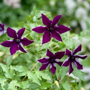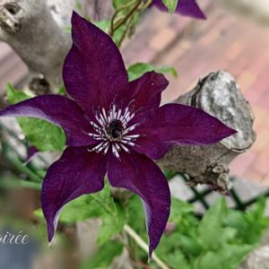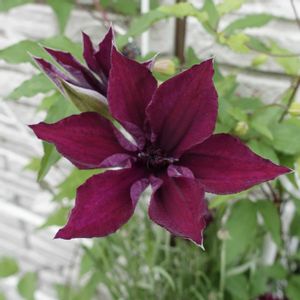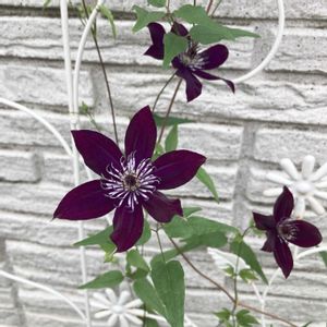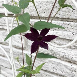 昨年の秋に二年生苗を植え付けた クレマチス ソワレが花を咲かせてくれました🥰 マイファーストクレマチス♪ ベルベットのような深い色です。 既に2mほどのトレリスの一番上まで到達し、ツルの先端が迷子になっています🌿 自分で巻きつく力が強く、誘引はほぼできなかったです💦