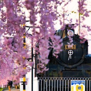 喜多方しだれ桜並木情報 6 SLの所は この時間(6時前)で無いと 人がいっぱいで😁