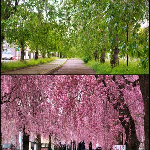 喜多方しだれ桜並木の今 🩷ピンクのしだれ桜が 🟢濃い緑のカーテンになっています