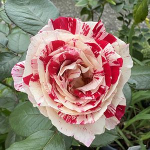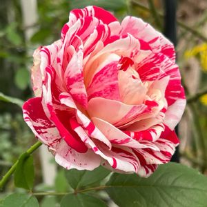 令和7年6月10日(火) 2025年ローズコレクション🌹🌹🌹🌹🌹 No.10 センチメンタル(木立性・四季咲き) 紅白の絞りが綺麗😍🎶クレマチスさんと寄り添って咲いていました😄🌹仲良し✨️ 今日は、☂️降りなのでお家で模様替えして過ごします💨 皆様、良い1日を☘️