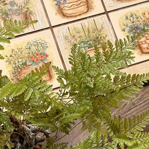 シダ愛好会🏷️ 毎月4日はシダの日🏷️ お散歩ちゃん🏷️色々で 投稿させて頂きます🌿 孫ちゃんたちも 週末に来ていた娘も それぞれの生活に戻り 今日は掃除も片付けもひと休み しばらく出来なかった トールペイントを 久々にしています 今日も庭のシダを室内に持ってきて 撮影しました 外での撮影は早朝しか無理ですね😅 シダは ダバリア・ラビットフットです だんだん育ってきて トキワシノブとの違いが 本当に分からない😅 日陰に置いてありますが 少しくらいは日が当たるようで 少し焼けた葉があったので✂️しました 小さな葉っぱも出てきていて 可愛いです🌱 今が成長期になるのかな? 3pic目以降は 今描いている作品の上で あおいちゃん撮影会👘 10cm角の四角が8枚並んでいて 岸本照美先生デザインの 8種類の寄せ植えを描いています 絵の上なので撮るのは簡単でした😊