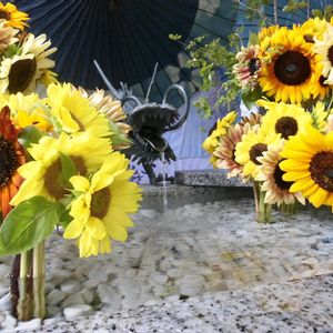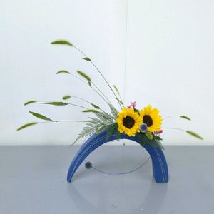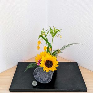 今日のお花 ヒマワリ その③ こちらは、一つ前にupしたお花と立花の残り等をまとめて自由花にしました。 ルリタマアザミはコロンと転がして🟣 このままドライにして、また自由花素材として使います😊