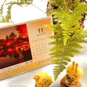 シダ愛好会🏷️ 毎月4日はシダの日🏷️ カレンダーの日🏷️ 一日遅れてめんごめんご🏷️で 毎月3日は耳の日🏷️ も投稿させて頂きます♪ シダは耳の日のうさぎに合わせて ダバリア・ラビットフットです …でハタと気付きましたが うさぎではあるけど 耳ではないね😅 うさぎの足じゃんね😆💦 ちいかわのうさぎで許してね🐰💕 2pic目にあるように モフモフの根茎が うさぎの足のようだということですが 買った当初は株自体が小さく 根茎も可愛いうさぎの足感がありましたが 今はだいぶ育って トキワシノブとの違いが分からず 根茎は絡みに絡まって ジブリ映画に出てきそうな雰囲気です😅 3pic目 よく見ると 根茎から新しい小さな葉が出ていて 可愛いです うさぎもうっとり☺️ 品種名タグは ダバリア ラビットフッドの方が 投稿数が多いのですが 買った時の名札や 名前で検索すると ラビットフットが正しいと思うのです 足=フットですもんね? 4pic目は カレンダーの写真が綺麗なので はっきり写してみました 名古屋の徳川園の 紅葉ライトアップの風景ですね🍁 撮影者のお名前も はっきりと印刷されていますが 調べてみたらインスタグラムで 美しい写真を投稿されている方でした こんな風景 観に行ってみたいな〜 なかなか行けないのよね💦