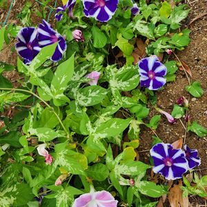 🤍💜西洋朝顔スノーフレーク💜🤍 ①②今朝咲いた2輪の花と ③種と蕾 ④肉厚で小さな葉っぱ 追伸 良くみたら④の葉っぱの付け根にも小さな蕾がありました😊♪