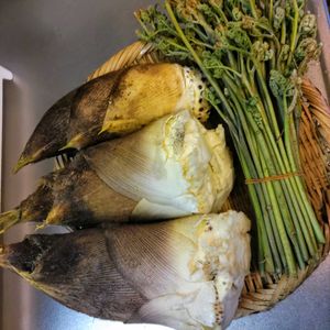 おはようございます🌤️🤗 。 昨日午前中、私達が畑借りてるご主人(ガーデン仲間)が、タケノコとわらび、持って来てくれました✨。季節の食べ物なので嬉しい🎶 米ぬかもちゃんと入れててくれ、ご夫婦の優しさが嬉しいです💓午後から、1時間近くかかって茹でました。 たけのこの頭がちょっとだけ出た所を良く見つけてくれて、柔らかい事この上無しで、夕飯に煮物して頂きました😋今夜はたけのこご飯作ろうと思ってます。わらびも重曹入れ茹で水に取り、いろいろ料理に使います🎶🌸🌸🌸皆さんも お食べ下さいね🤗。