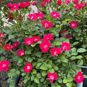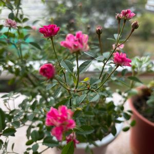 うちの薔薇たち。.:✤*゜🌹✨ ①種まきからのミニバラ ルポ💕 小さなお花がいっぱいで可愛い🤭 ②ミニバラ スイートチャリオット 元、見切り品🤭 ③兄のお花をもらって挿し木した ジュビレ デュ プリンス ドゥ モナコ 茎が細くて〜下を向いちゃう😅 ④義父から挿し木をもらった 名前のわからないバラ🌹