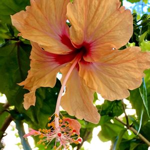 こんにちは😊 今日の天気は晴れ時々曇り🌤️ 最高気温31度 最低気温27度 我が家の小さな花壇より🌸🌼🌺 🌿🌺ハイビスカス🌺🌿 ①我が家のハイビスカス🌺フラミンゴ🦩さんが今朝は一重咲きで咲いています💕🌺 6月14日投稿時は八重咲き…4月23日は一重咲きと一重咲き➡️八重咲き➡️一重咲きと交互に咲いています😳不思議〰️⁈ 2024.3.26には一重咲きと二重咲きの同時開花が見れましたね💕😅 お時間があれば覗いてみて下さいね👀本来は綺麗なオレンジ色🧡の2段咲きの花姿 が素敵なハイビスカスです💕🥰花弁の中心部は濃紅色…外側はオレンジ🧡濃紅色の網目模様が入っています💕❤️🌺🧡 挿し木っ子2年目⁈のハイビスカス🌺フラミンゴ🦩です➰🤗 ②八重咲きハイビスカス 今朝は高い場所に一輪咲いています💕蕾もちらほら…未だ未だ咲いてくれそうです💕🌿🌺🌿 ③④黄色いハイビスカス 我が家の美人さんの黄色いハイビスカスは今が花盛りです💕🌿🌺💛🌺🌿挿し木プランターも次々に花を咲かせて賑やかですね💕😳 ⑤フウリンブッソウゲ🌺🎐 今朝は3輪〜花を咲かせ…真っ赤な花が青空に映えて綺麗です💕🌿🌺🌿 🌺•*¨*•.¸¸☆•*🌿🌺🌿•*¨*•.¸¸☆*・🌺