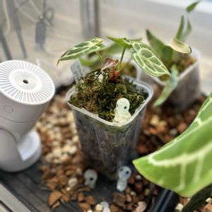 温室育ちの子たち 新芽がすくすく育ってます^_^ ビニールハウスの中で光が乱反射していることが原因みたいなのですが、上に向かず、放射状に広がっている 遮光して光の方向をコントロールしなくては… アンスリューム可愛い😍