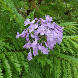 ジャカランダ ノウゼンカズラ科キリモドキ属 ジャカランダは「カエンボク」「ホウオウボク」と並んで世界3大花木の1つに数えられています🌲 南米産の植物で 5mを越えるものもある大きな花木で🌲5月から6月にかけて青紫色の小さなお花を50花以上ブドウの様に房状に咲かせます💜 静岡県熱海市に咲いていました🤳