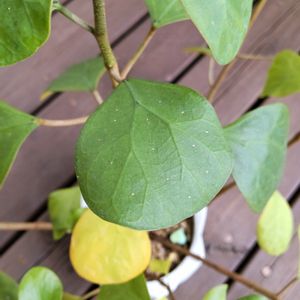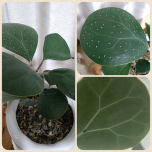 フィカス ゴールドコイン✨🌿✨ おにぎりみたいな葉っぱの形。 葉の表面にポチポチが見え、葉の裏側は黄色で、黒いポチが見えると言う変わった葉っぱちゃん💚