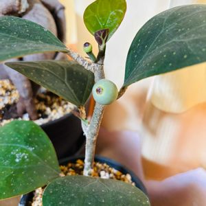 5月スタートは☁️→☔️予報 ちょっと肌寒いです 先月恒例の🏫即売会で迎えた フィカスゴールドコイン🪴 (*′艸`)初めましての子。 目玉おやじみたいな実は どう成長していくのかな😊