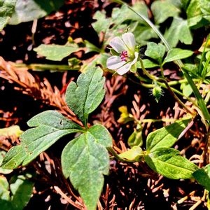 コフウロ(子風露) *フウロソウ科フウロソウ属 花期は8〜9月 山形県.宮城県以南から九州の山地の林内に生育する多年草! 高さは10〜40cm 茎は細く倒れて広がる! 下部ではほとんど毛が無く上部に屈毛.圧毛あり! 葉は互生し3複葉で3全裂! 萼片の外側には長めの開出毛がり、5枚の萼片の先は芒状に尖る! 花色は白〜淡紅紫色! 花弁に隙間があるので萼片が目立つ! ①小さくてひっそり咲いています! ②雄蕊10個.葯は青紫色! ③花弁の先端はややくぼむ! ④横から!茎の圧毛.萼片に開出毛! ⑤特徴の神輿草にはもう少し! ゲンノショウコと良く似ていますが! 葉の形や、毛の種類など大分違いのあるフウロソウの中間でした! 一般に言われる分布域に入っていない岩手県での発見も驚きでした‼️ 9月14日撮影 岩手県