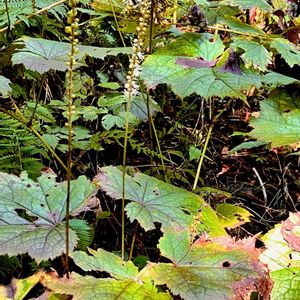 オオバショウマ(大葉升麻) *キンポウゲ科サラシナショウマ属 花期は8〜9月 本州〜九州の山地や深山のやや湿った林内に生える多年生! 高さは50〜120cm 根生葉は1-2回3出複葉で互生! 小葉はやや光沢があり円心形で掌状に中〜浅裂する! 花は細長い穂状花序で下から咲き上がる! ①林の中の群落! ②ブラシ状の雄蕊! ③葉は光沢があります! 似たイヌショウマの分布は関東〜近畿地方! 葉は2回3出複葉! 9月14日撮影